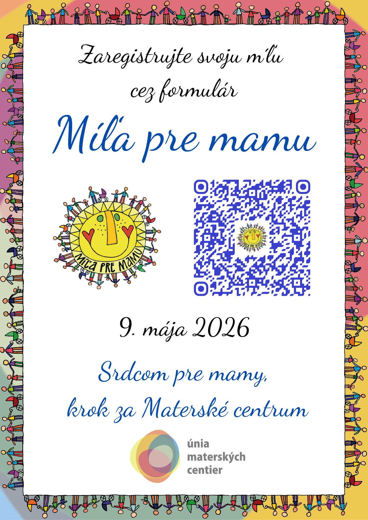 Míľa pre mamu je celoslovenská kampaň, ktorú Únia materských centier organizuje nepretržite už od roku 2004. Kampaň je známa ako Najväčšia oslava dňa matiek na Slovensku. Každoročne pribúdajú noví organizátori, ktorí sa podieľajú na prípravách kampane vo svojich mestách a obciach. Účasťou verejnosti na kampani, v jednotlivých mestách Slovenska a zahraničia, zase pribúdajú registrovaní účastníci Míle pre mamu. Staňte sa aj vy súčasťou najväčšej oslavy Dňa matiek na Slovensku.